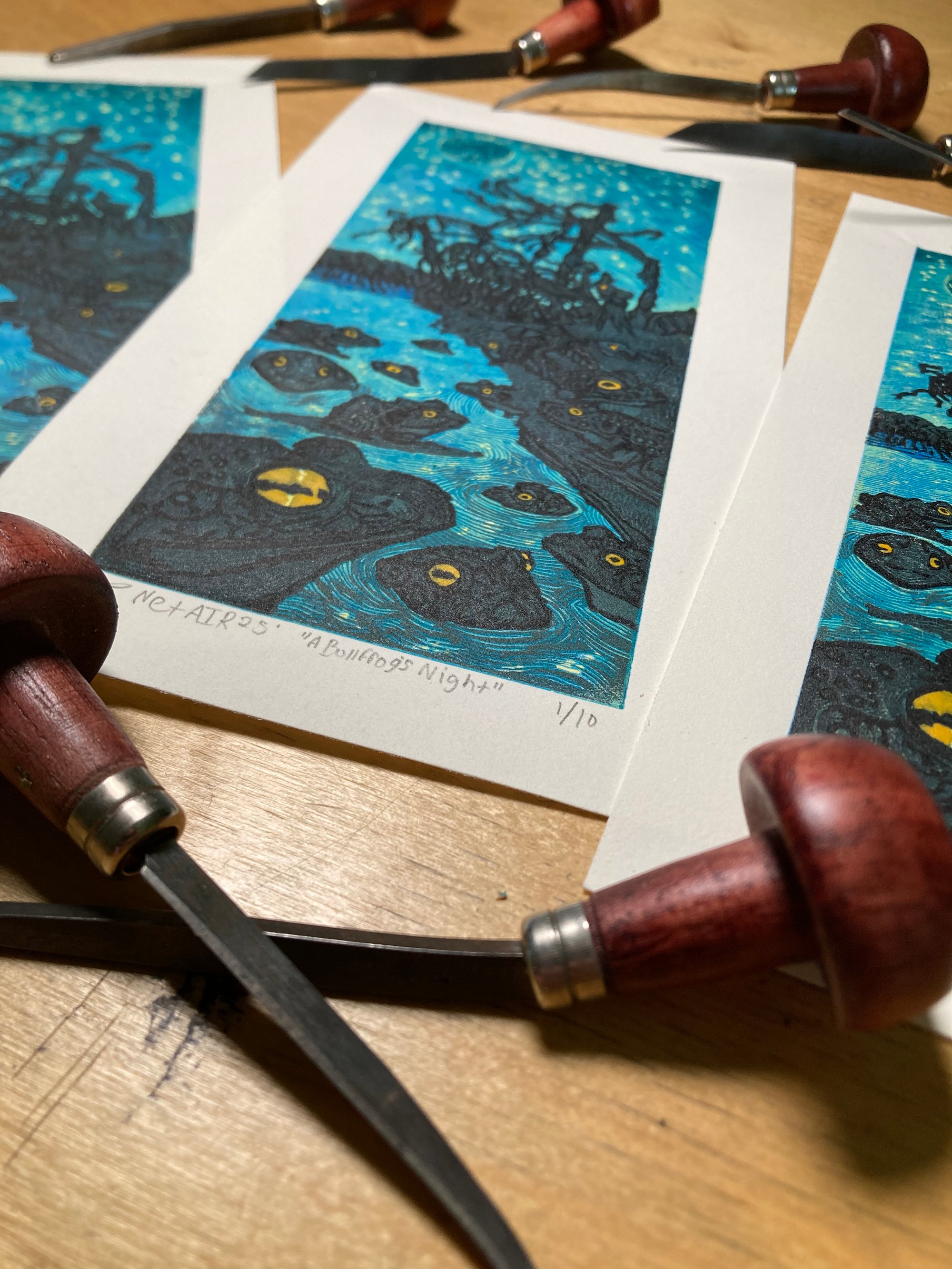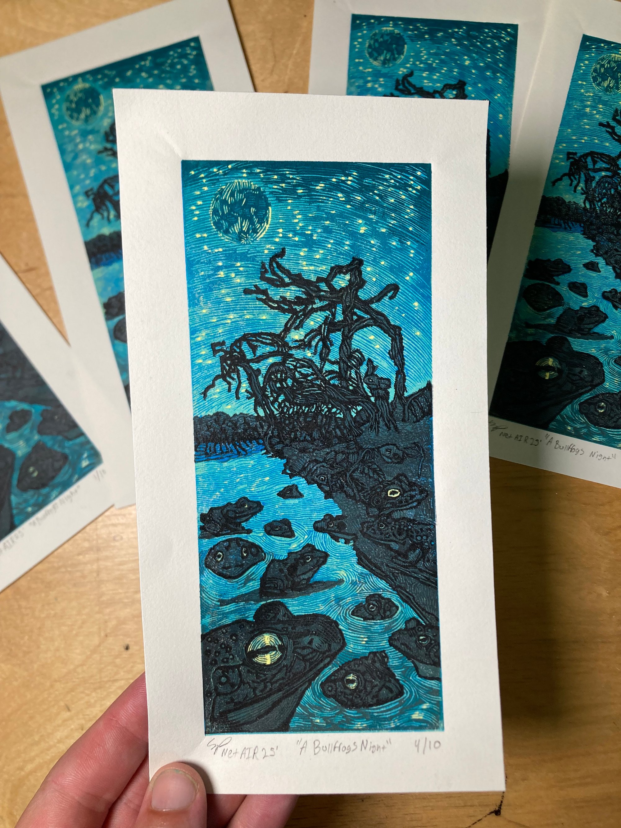 My second print for my Artist In Residency for the New England Trail, showing off a bundle of bouyant bullfrogs croaking the night away. A very limited edition of 10, with only 5 available for purchase. All come matted and mounted.