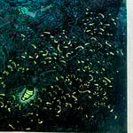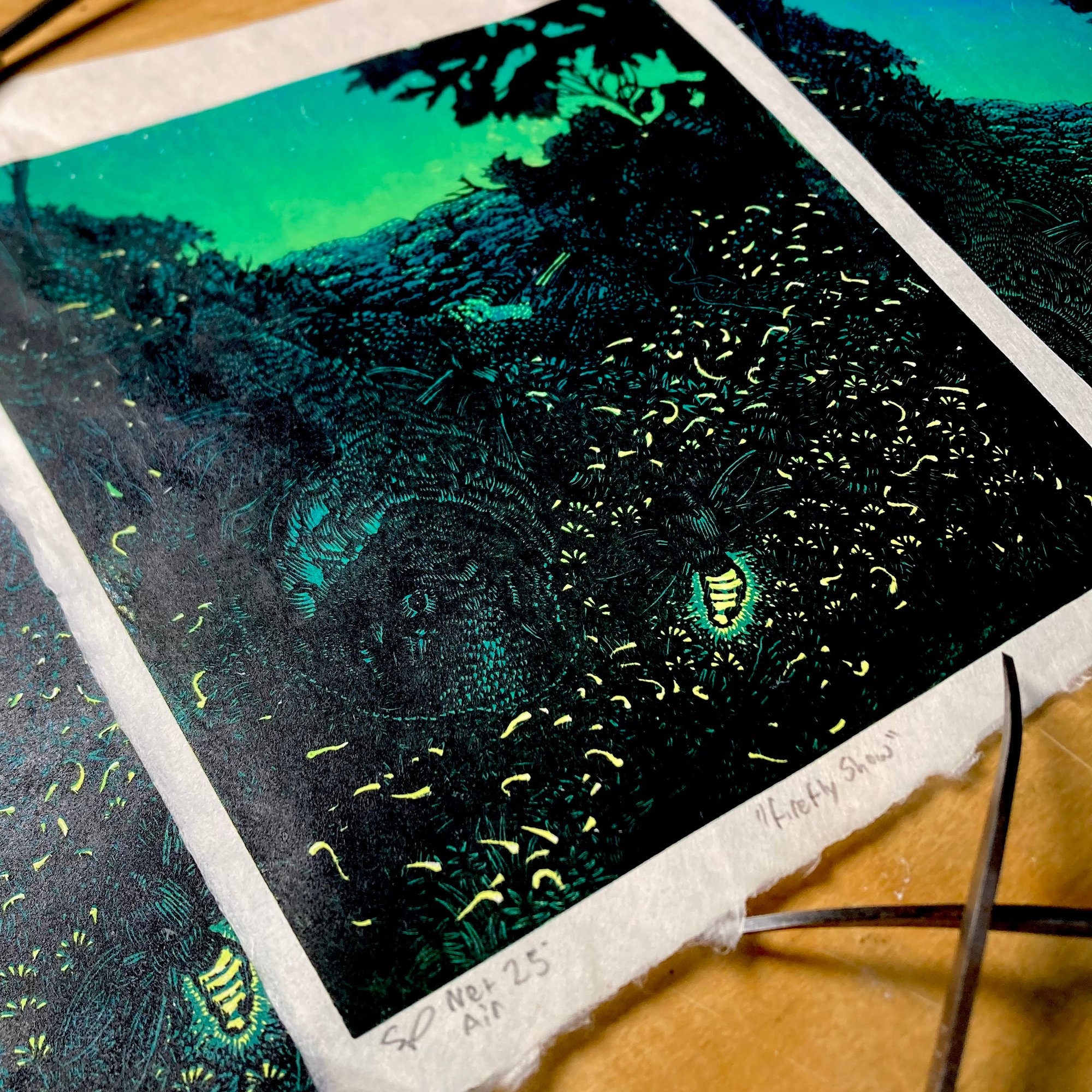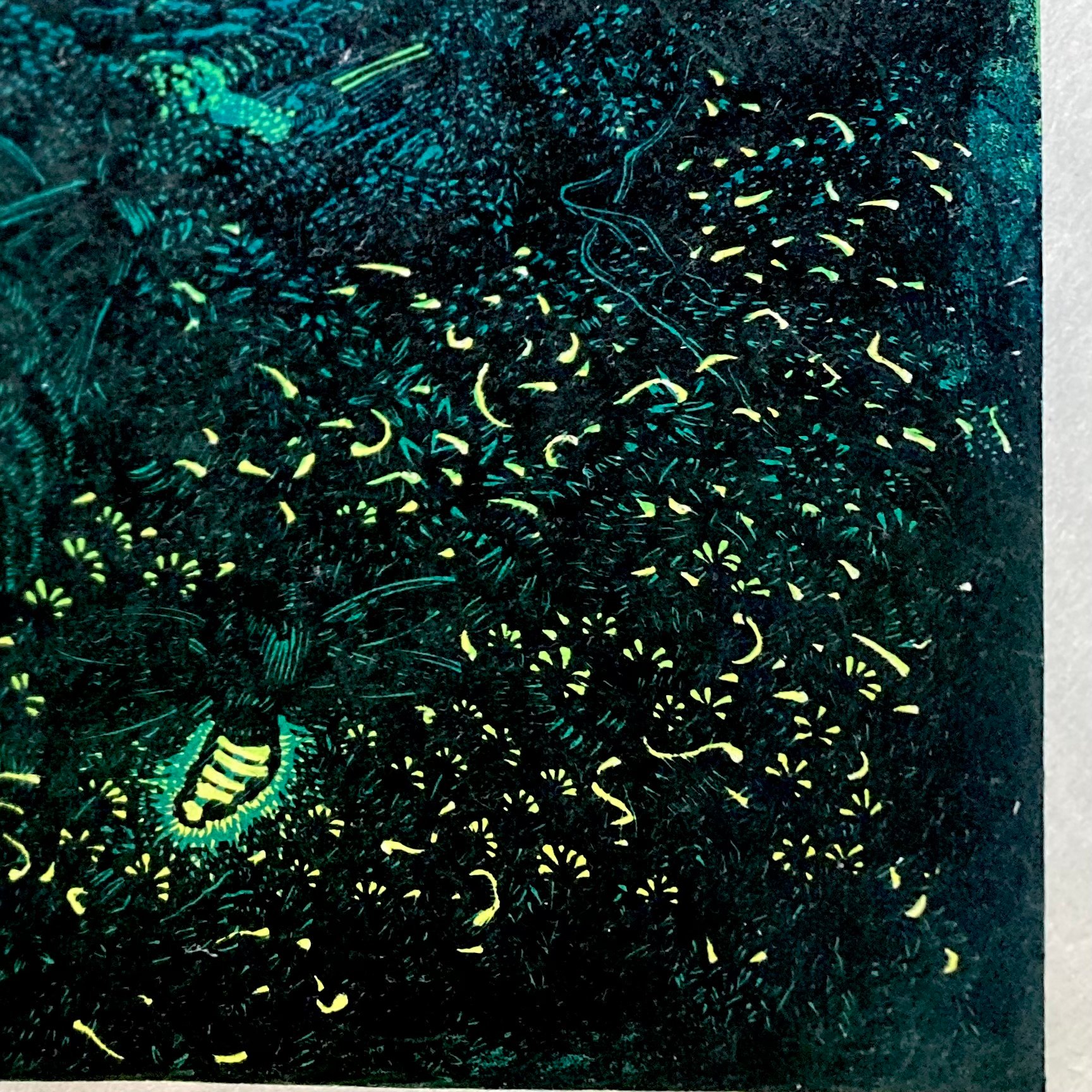 Eastern Red Bat with Fireflies - Wood Engraving Reduction Print